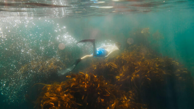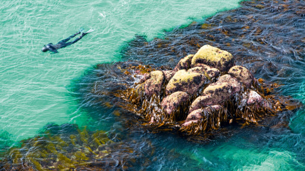 Free diving over underwater kelp forest in Southern California. Photo: Cavan Images / Alamy.