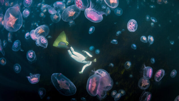 Free diver with monofin, surrounded by moon jellyfish. Photo: Connect Images / Alamy.
