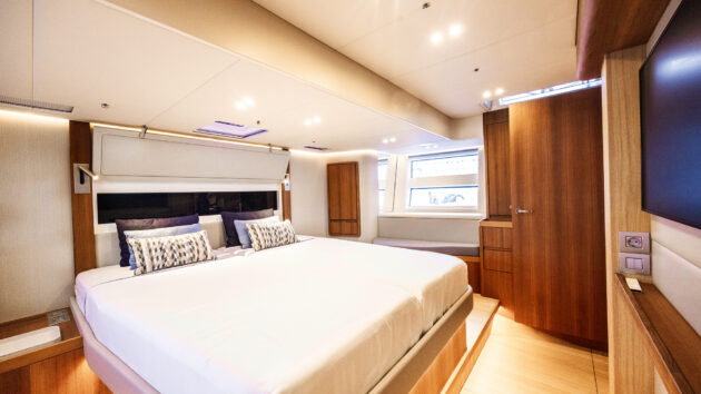 Large owner’s cabin aft with its increased light and views through larger hull portlights. Photo: Andreas Lindlahr/EYOTY