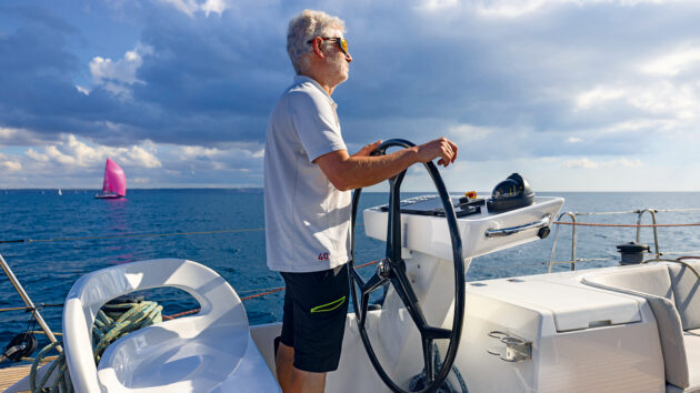 Rupert on the wheel with double helm seat which rotates to make use of aft deck. Photo: Ben Scheurer/EYOTY