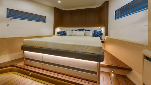 Huge double berth in the minimalist owners’ cabin is sited right forward, while entry to the ensuite is to starboard. Photo: Luca D’Ambrosio/The International Yachting Media