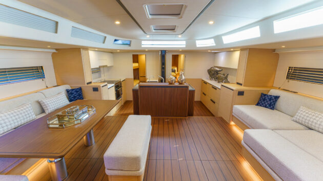 Descending the companionway you’re hit with a distinct impression of space. The transverse galley forward of the saloon aids this by leaving a wide, open area in the main saloon. The slim, wraparound style forward-facing windows and large hull portlights with mirrored surrounds fill it with natural light.