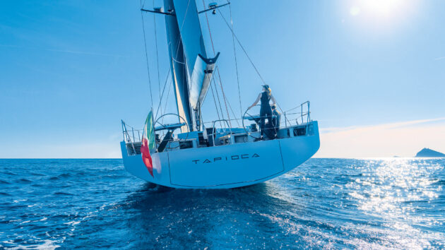 Modern, alluring shape: plumb stem and fine entry, with maximum beam carried all the way aft, gives good form stability (needed with that much sail area!). Photo: Luca D’Ambrosio/The International Yachting Media