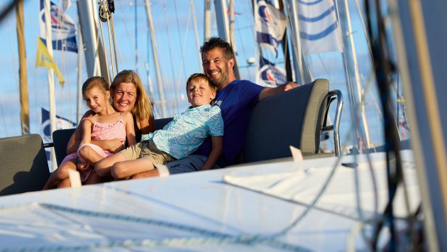 The Hamilton family on their new Fountaine Pajot Elba 45 Starry Night. Photo: James Mitchell/World Cruising Club