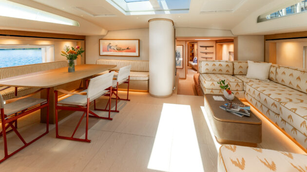 Split level main saloon, with eight person dining table to port and large sofa daybed opposite, with steps leading down to TV snug/lounge. Photo: Oriol Esteve/Photonautic
