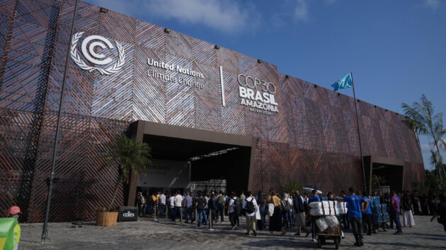 Attendees line up to get into the COP30 U.N. Climate Summit, Monday, Nov. 10, 2025, in Belem, Brazil. Photo: Fernando Llano / Getty.